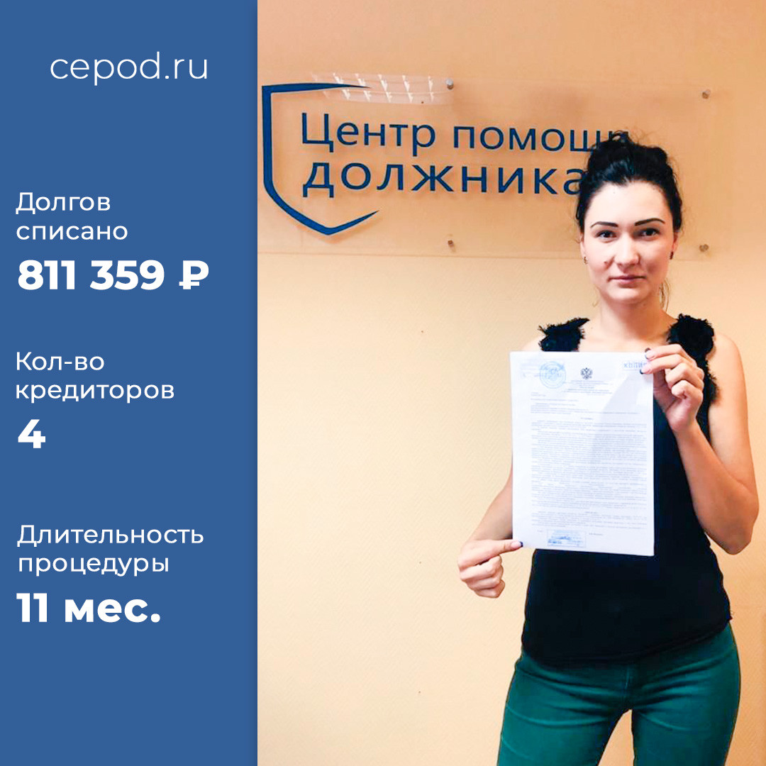 Успешно проведена процедура банкротства клиентке из Балашихи. Списано долгов на 800 000 р. за 11 месяцев. Кол-во кредиторов - 4 шт.